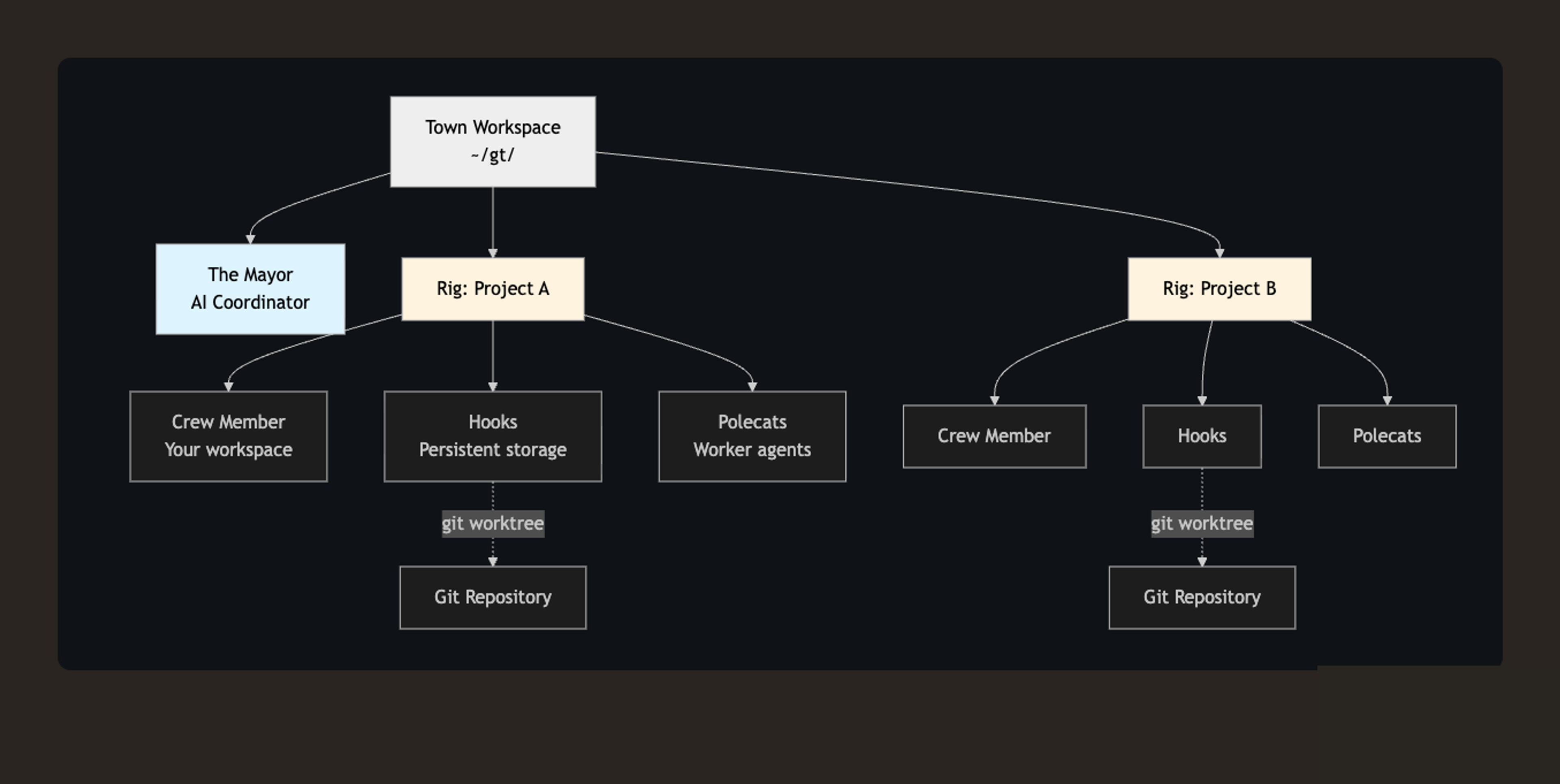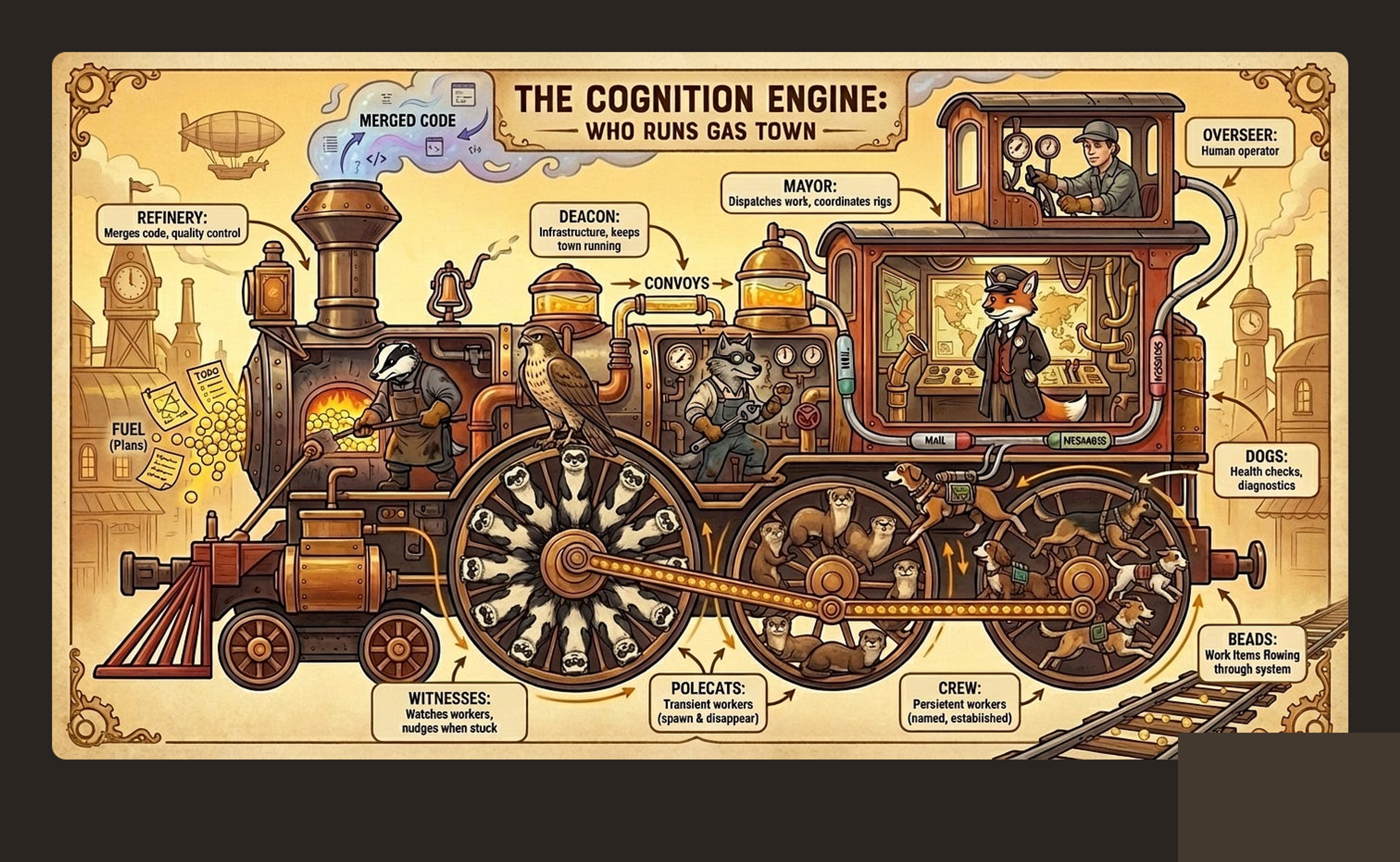 The animal names are whimsical, but the roles are not. The Mayor coordinates work across the town. Crew are long-lived named workers. Polecats are transient workers for discrete tasks. Witness manages polecats per rig. Refinery handles merge processing. Deacon and its dogs keep the system healthy (dogs are not for user work). (Gas Town Docs)