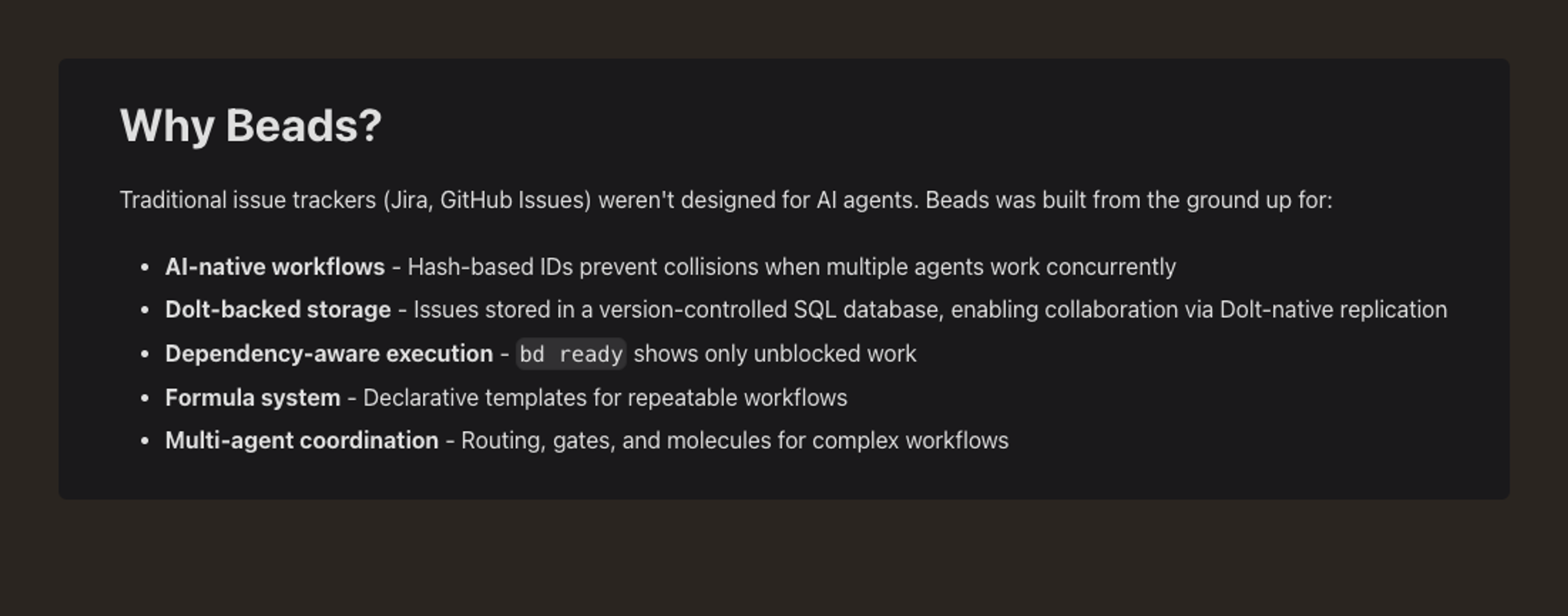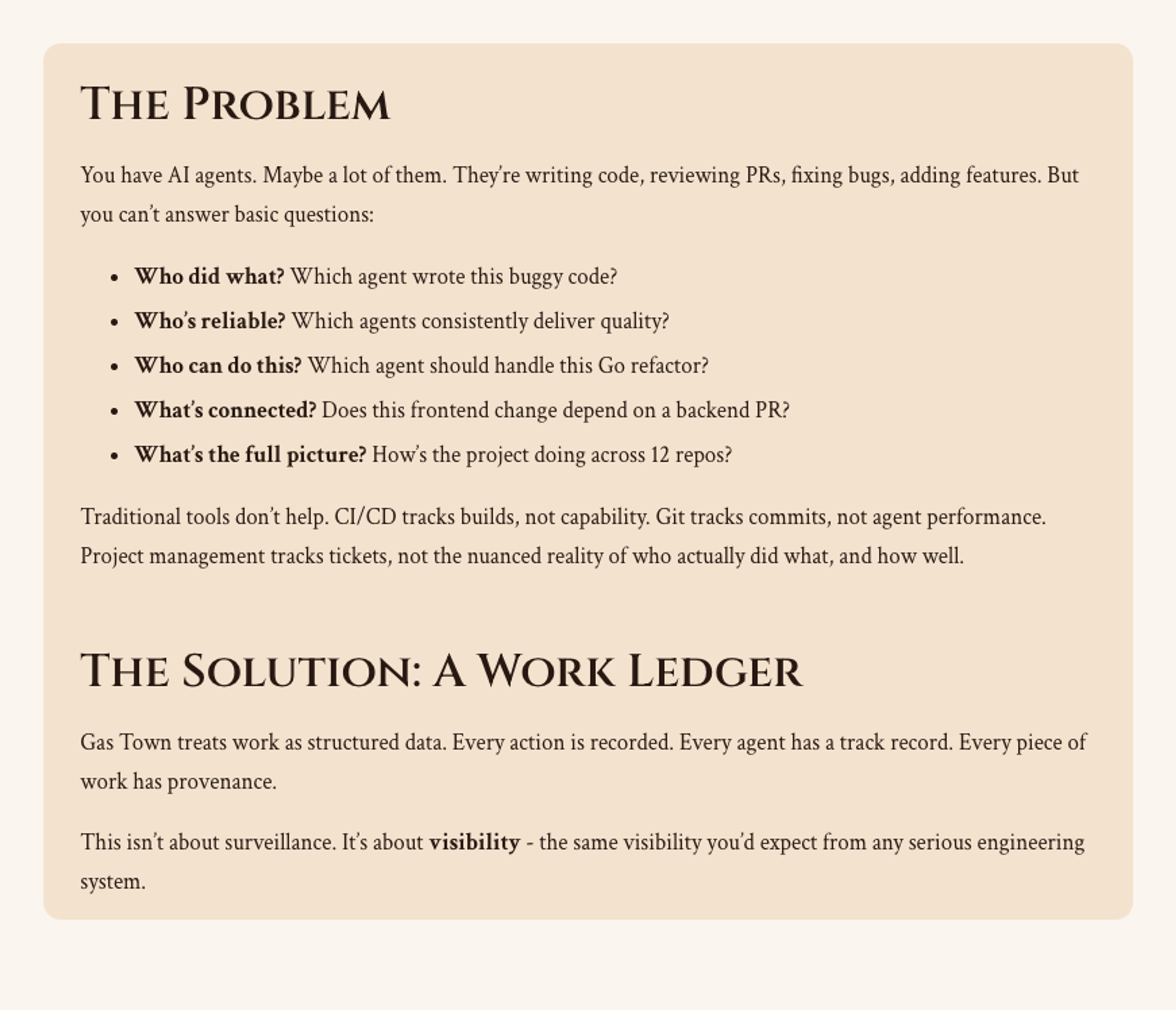 - Strong provenance. Commits, beads, and town events can all be attributed and queried.