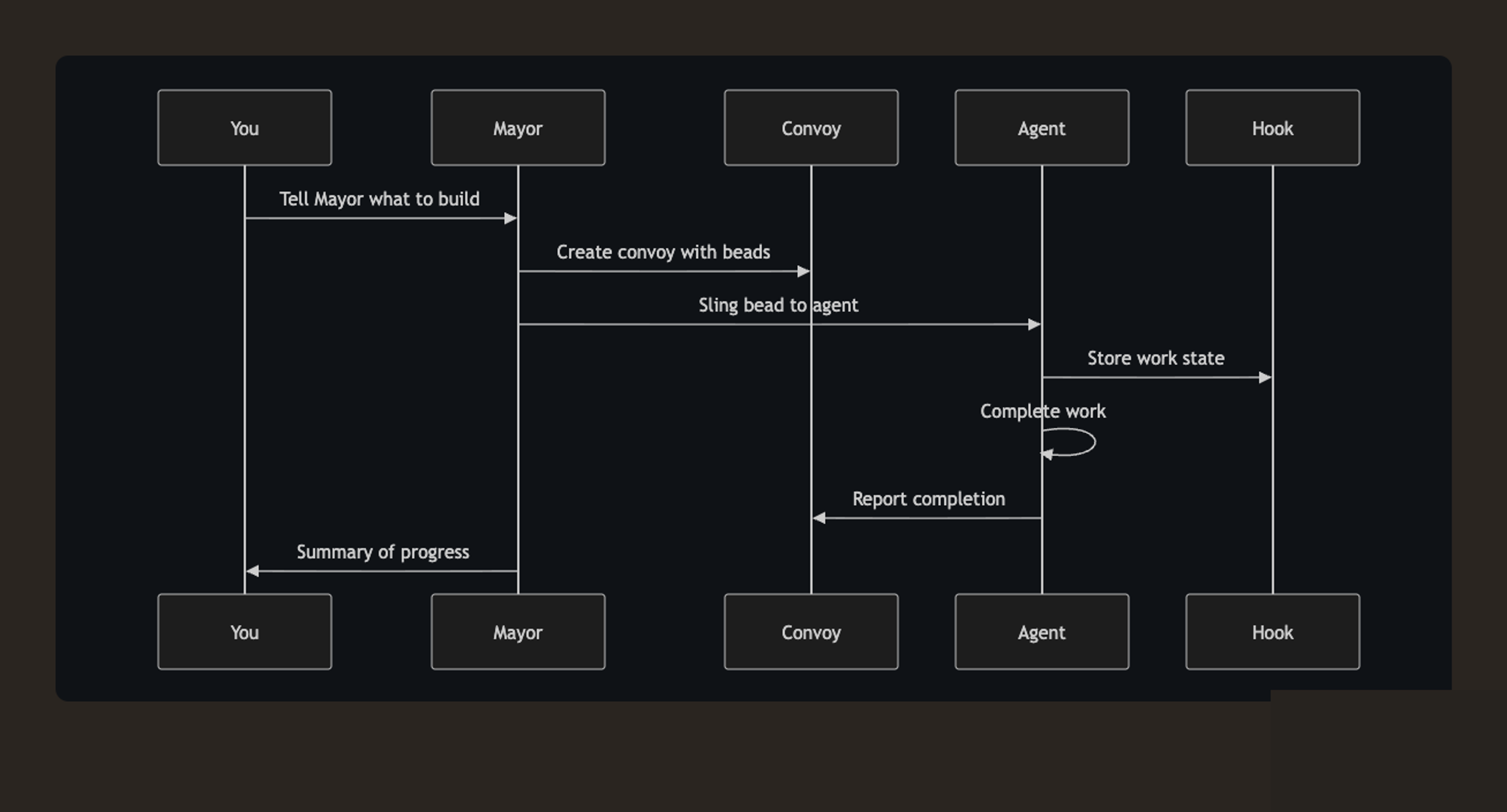 A rig is a project container. A bead is a work item in the Beads system. A convoy tracks related work (the docs explicitly say to use one even for a single issue). A hook is attached work that survives restarts, handoffs, and context compaction. (Gas Town Docs)